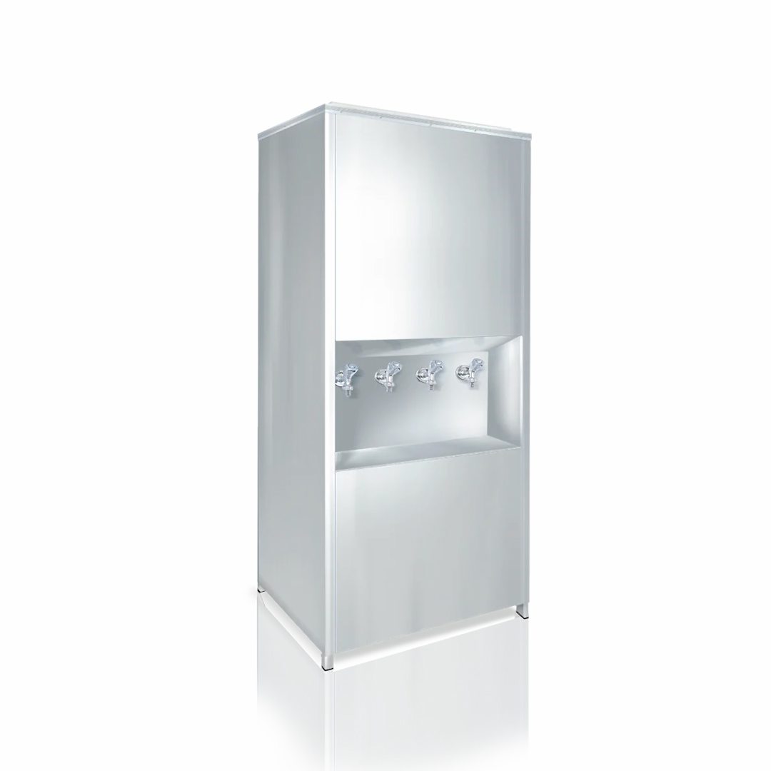 EM 350 Arıtmalı Su Sebili; 5 aşamalı RO filtrasyon, 350 L soğuk su kapasitesi, CR-Ni paslanmaz gövde ve R404 soğutucu gazıyla fabrikalar, yemekhaneler ve okullar için ideal. 1000 W güç, 60 PSI basınç düşürücü, manuel termostat ve pompalı/pompasız seçenekleriyle güvenli, verimli ve hijyenik su sunar.